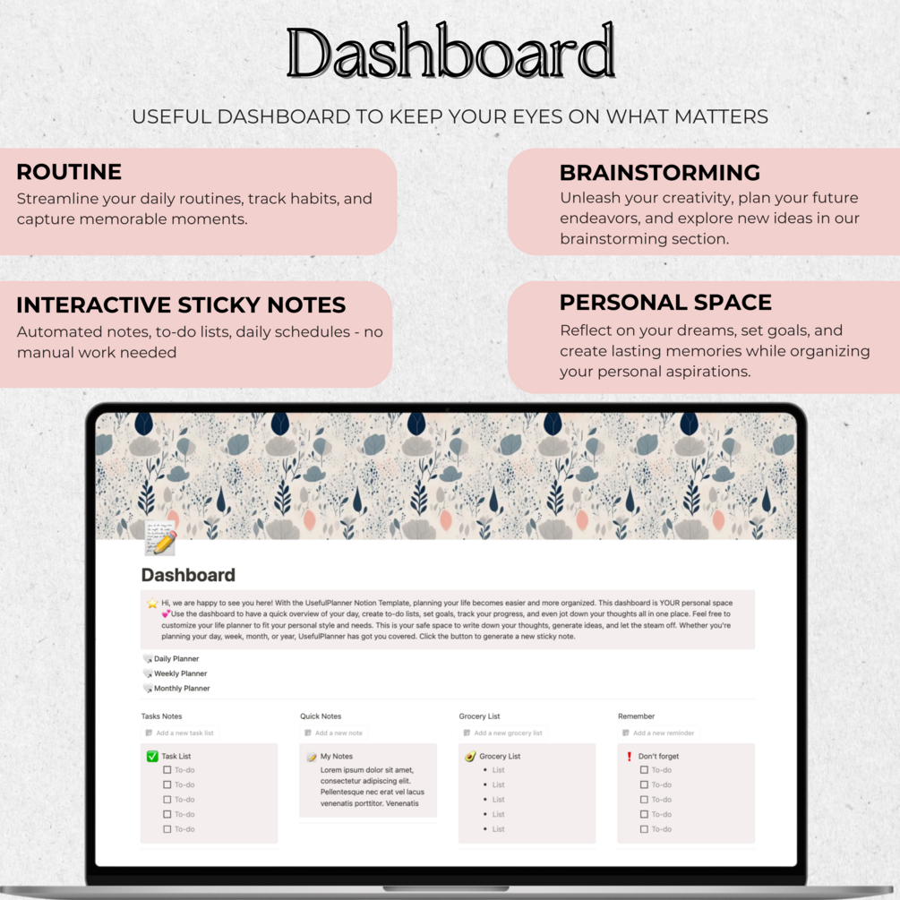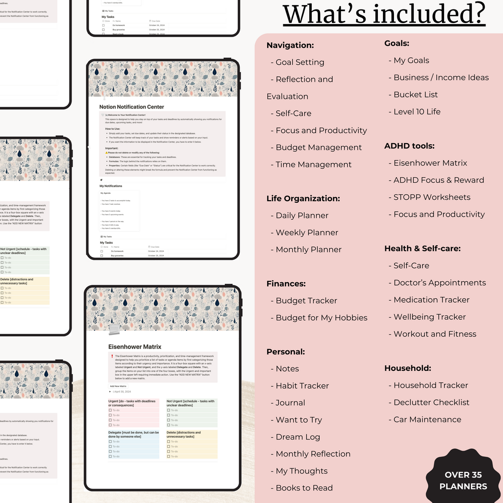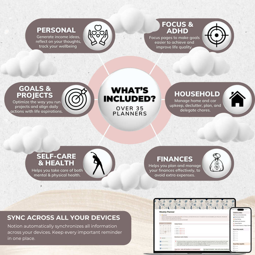 🌸 This planner includes big sections, such as: Life Organization, Focus Section, Household, Finances, and a cherry on the cake - highly-personalised Dashboard, which will serve you as your personal space to plan, fulfill and achieve your goals and dreams, with the help of 14 templates, which cover the sections, such as: hobbies, habit tracker, journal, brainstorming, level 10 life, bucket list, business ideas, dream log, monthly reflections, Eisenhower matrix, etc.