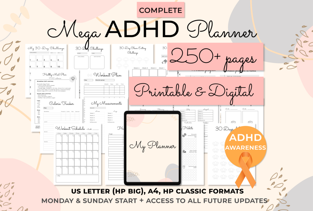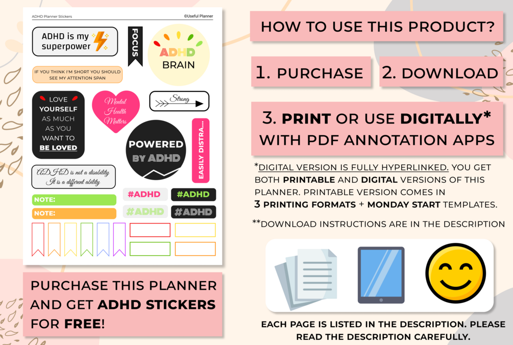🌸 This planner includes a fully-hyperlinked digital planner version, a printable version in 3 different printing formats + Monday or Sunday start, and two freebies: ADHD stickers and a weekly planner + tips for staying organized with ADHD