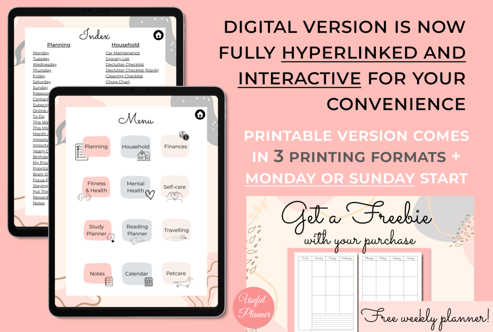 🌸 This planner includes a fully-hyperlinked digital planner version, a printable version in 3 different printing formats + Monday or Sunday start, and two freebies: ADHD stickers and a weekly planner + tips for staying organized with ADHD