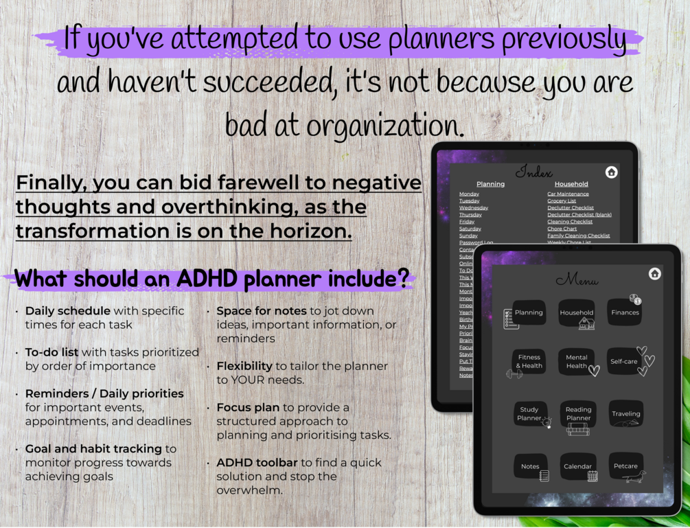 Are you tired of feeling overwhelmed and scattered? This ADHD planner is designed to help you manage your time, focus on priorities, and make life just a bit more manageable. It’s simple, customizable, and crafted specifically for ADHD brains to help you build routines, tackle tasks, and keep everything in one place.