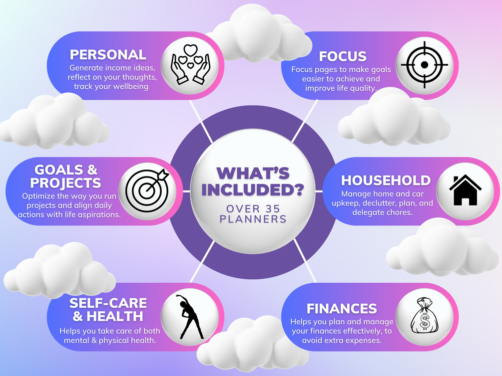 🌸 This planner includes big sections, such as: Life Organization, Focus Section, Household, Finances, and a cherry on the cake - highly-personalised Dashboard, which will serve you as your personal space to plan, fulfill and achieve your goals and dreams, with the help of 14 templates, which cover the sections, such as: hobbies, habit tracker, journal, brainstorming, level 10 life, bucket list, business ideas, dream log, monthly reflections, Eisenhower matrix, etc.