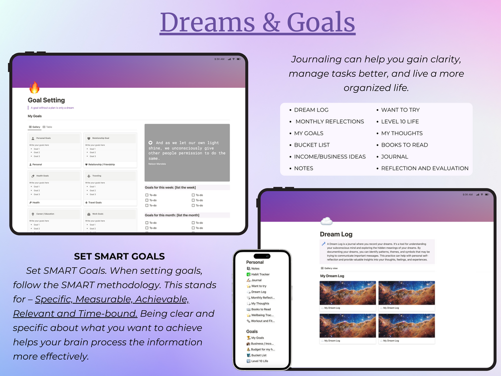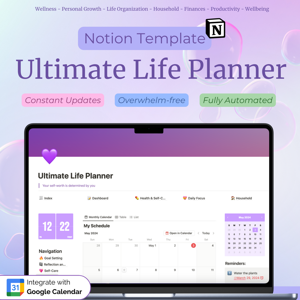 This Notion planner is beginner-friendly and easy to use while offering comprehensive and automated features. Combining beautiful design with top-notch functionality, it is perfect for setting goals, tracking your life, or staying organized. Clean layout and organized navigation make it easy to use.