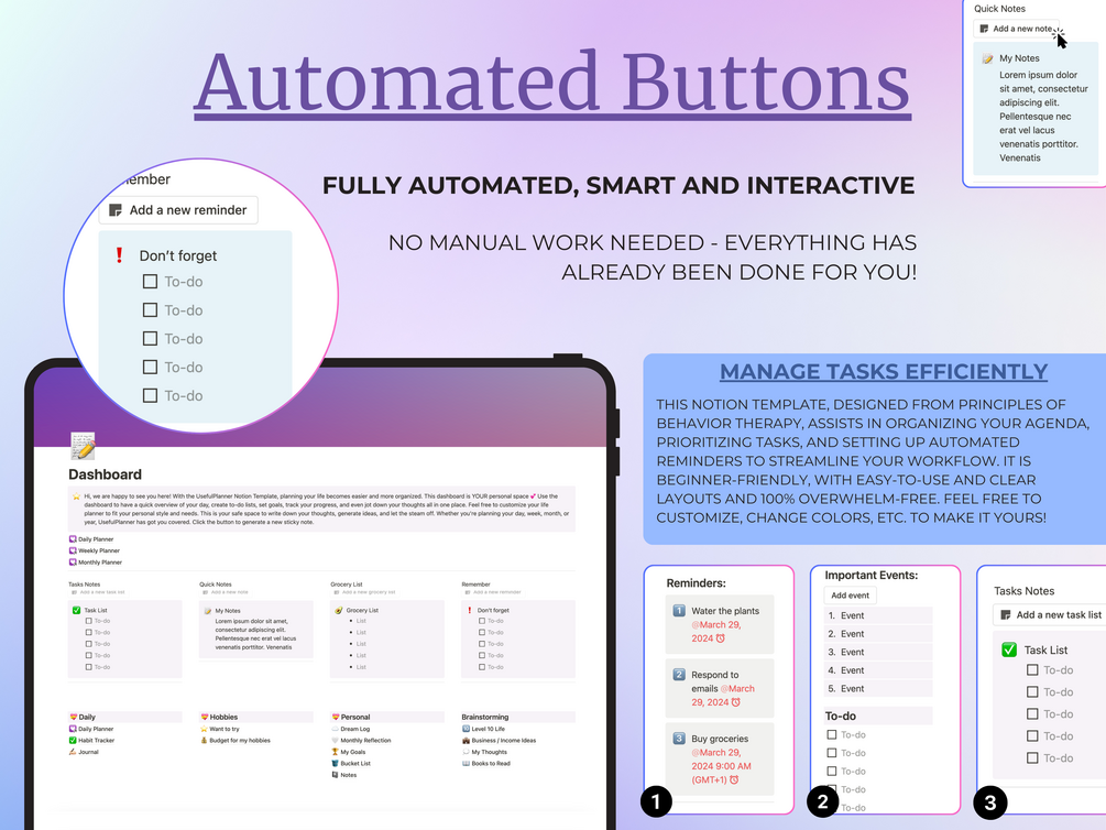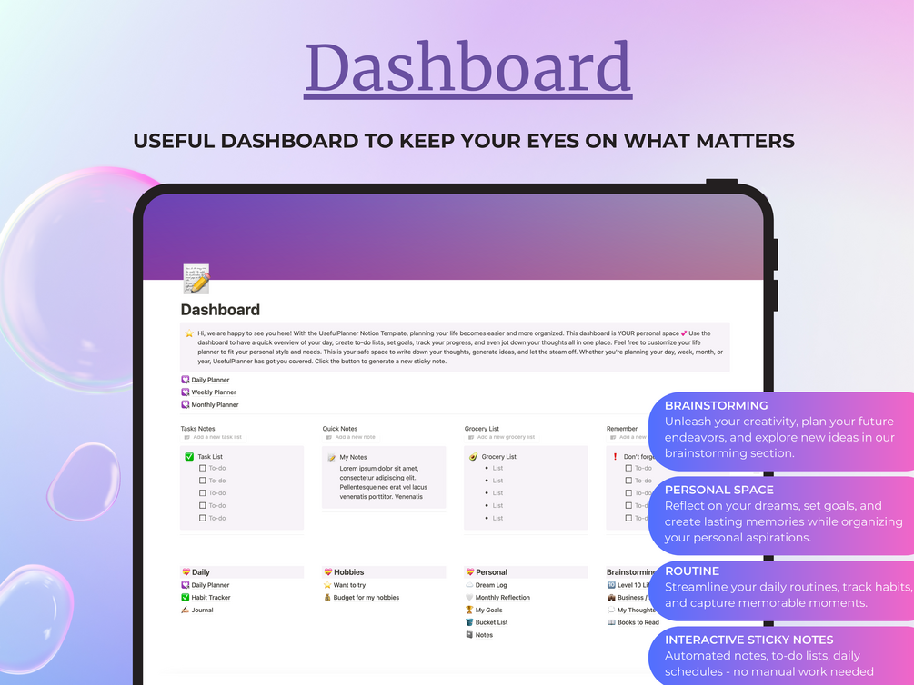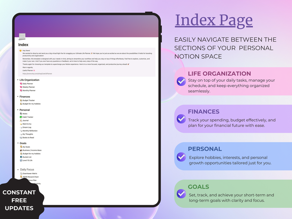 🌸 This Notion planner includes unique templates, such as: Focus Plan, Reward Chart, Staying on Task, Prioritizing Goals, Declutter checklists, and tons of other useful templates developed by UsefulPlanner, which will give you enough flexibility to tailor your planning experience to your individual needs and preferences. ⭐️🤩
