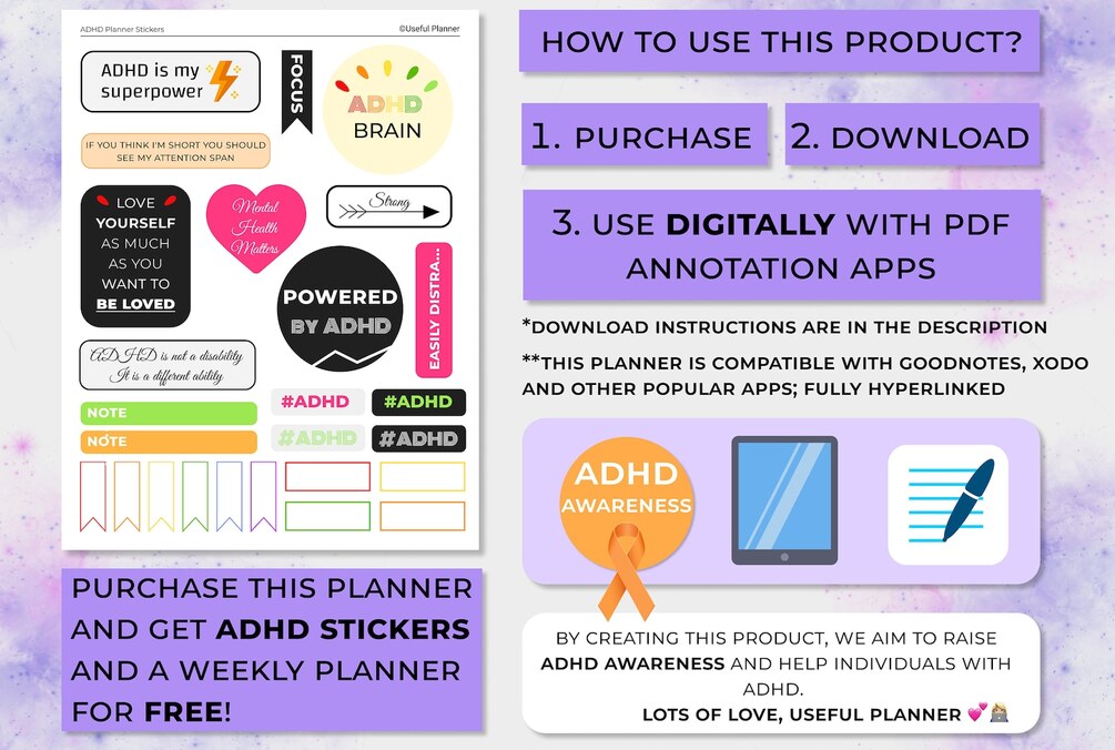 🌸 This planner includes a fully-hyperlinked digital version and two freebies: ADHD stickers and a weekly planner