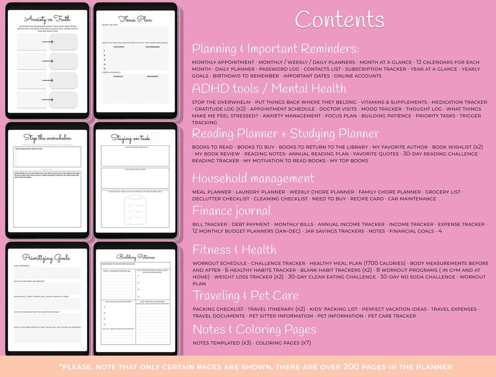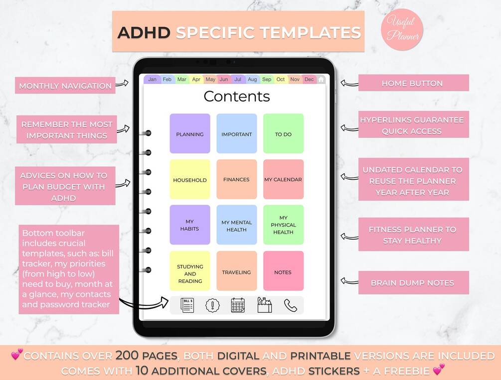 THIS IS A DIGITAL DOWNLOAD / NO PHYSICAL ITEMS WILL BE SENT TO YOU / US LETTER FORMAT / over 200 PAGES / ready to print / can be imported to goodnotes & xodo / fully hyperlinked / printable planner / digital planner / ADHD planner stickers